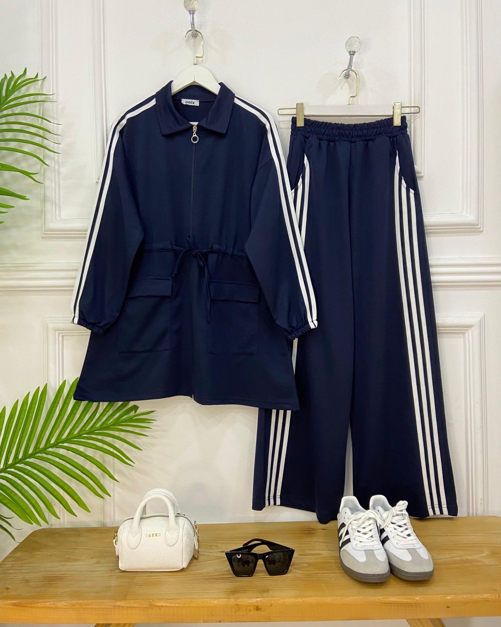 Yeni Sezon-Hırka ön kısmı fermuarlıdır-ceplidir-Bel kısmı sıkıştırılabilen tünelli bağcıklıdır-Bilek kısmı lastiklidir-pantolon ceplidir ce bel kısmı lastiklidir-pantolon yan kısımları ve hırkanın kol üstü kısmı şerit detaylıdır