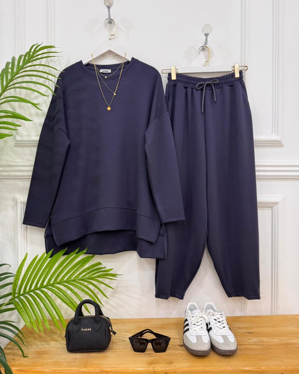 Yeni Sezon-Tunik ön kısmı oval kesimdir,Yanları yırtmaçlıdır,Düşük koldur-Pantolon ceplidir,şalvar kesimdir,bel kısmı sıkıştırılabilen tünelli bağcıklıdır ve lastiklidir