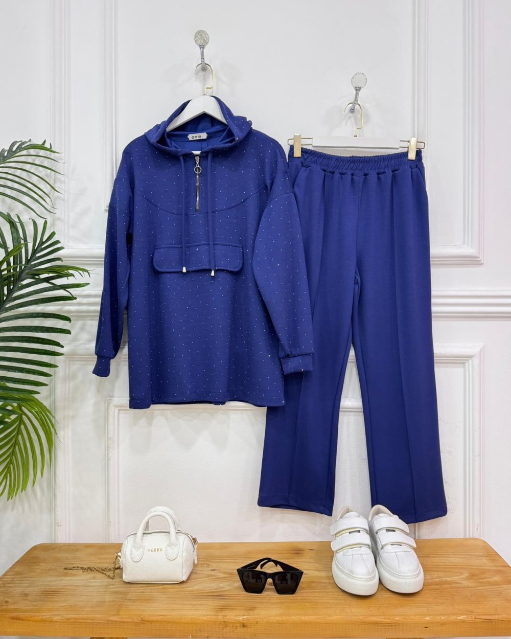 Yeni Sezon-Tunik tamamı taşlıdır,kapşonludur,bağcıklıdır,ön kısmı fermuarlıdır -Pantolon ceplidir,çımalıdır  bel kısmı lastiklidir-Yumuşacık dükümlü likralı bir kumaşı vardır