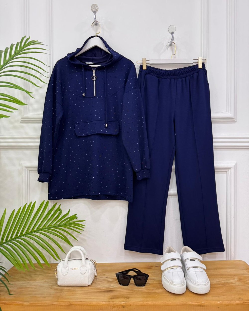 Yeni Sezon-Tunik tamamı taşlıdır,kapşonludur,bağcıklıdır,ön kısmı fermuarlıdır -Pantolon ceplidir,çımalıdır  bel kısmı lastiklidir-Yumuşacık dükümlü likralı bir kumaşı vardır