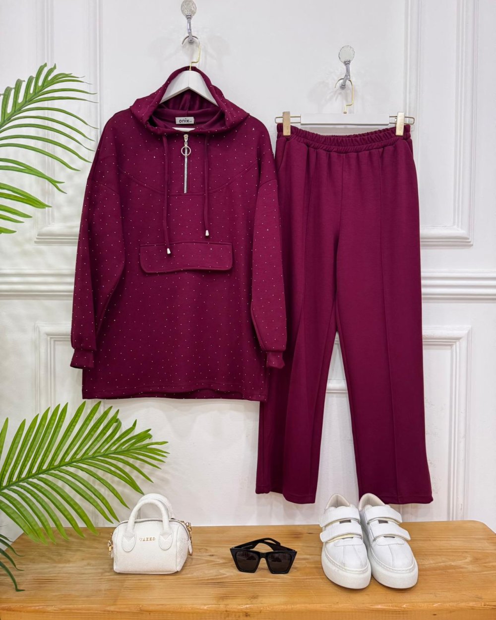 Yeni Sezon-Tunik tamamı taşlıdır,kapşonludur,bağcıklıdır,ön kısmı fermuarlıdır -Pantolon ceplidir,çımalıdır  bel kısmı lastiklidir-Yumuşacık dükümlü likralı bir kumaşı vardır