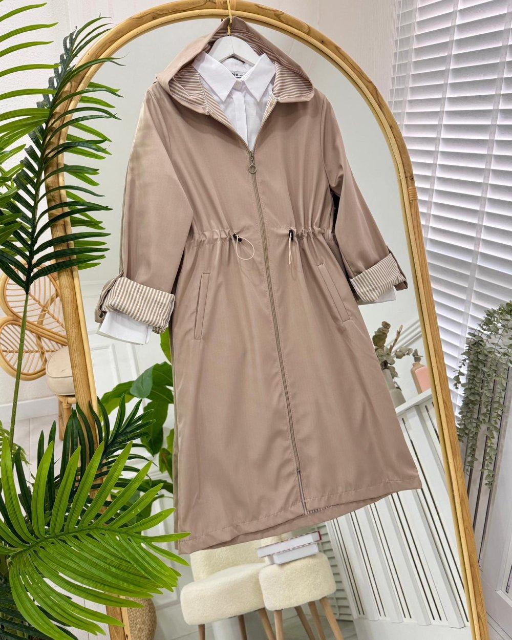 Yeni sezondur-Su itici kumaştır-Ceplidir-Ön kısmı fermuarlıdır-Kapşonludur-iç kısmı çizgili baskılıdır-Bel kısmı sıkıştırılabilen tünelli bağcıklıdır-Kolunda düğmeli  apolet vardır katlanabilir