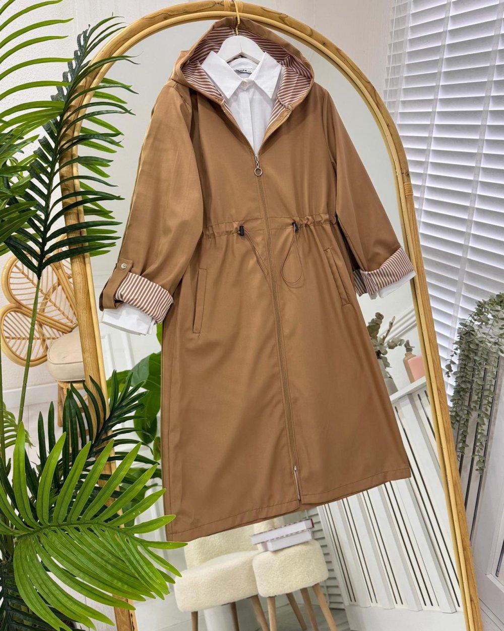 Yeni sezondur-Su itici kumaştır-Ceplidir-Ön kısmı fermuarlıdır-Kapşonludur-iç kısmı çizgili baskılıdır-Bel kısmı sıkıştırılabilen tünelli bağcıklıdır-Kolunda düğmeli  apolet vardır katlanabilir