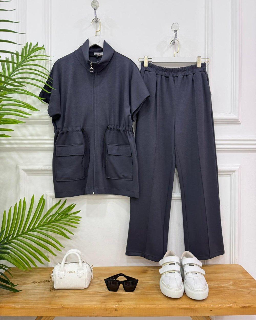 Yeni Sezon-Yelek ön kısmı fermuarlıdır ,ceplidir,bel kısmı sıkıştırılabilen tünelli bağcıklıdır pantolon ceplidir,bel kısmı lastiklidir,ön kısmı çıma dikişlidir,Yumuşacık dükümlü likralı bir kumaşı vardır