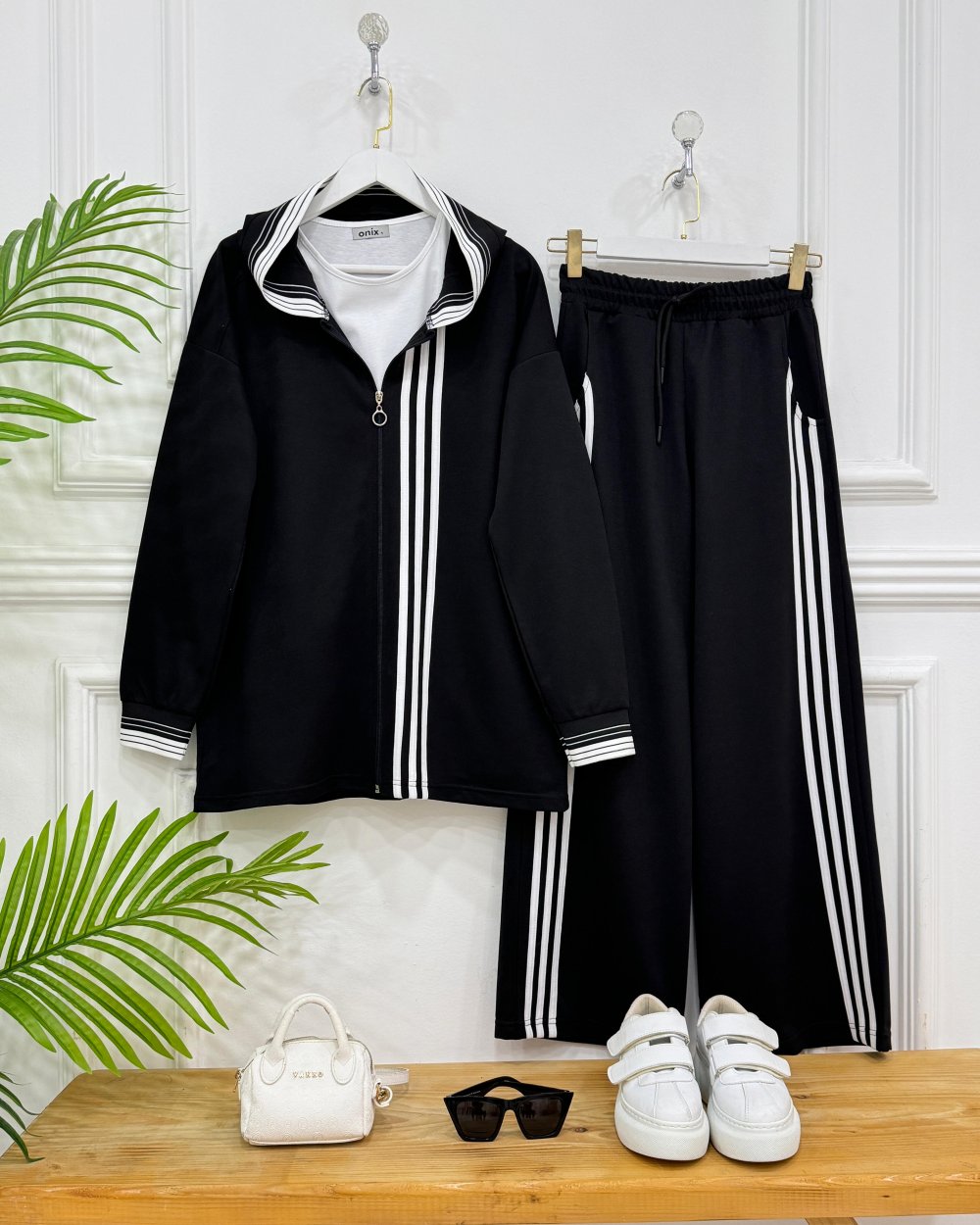 Yeni Sezon-Hırka ön kısmı fermuarlıdır-Kapşonludur-Kapşonun uç kısmı ve bilek kısımları ribanalıdır-pantolon ceplidir ,bağcıklıdır ve bel kısmı lastiklidir-pantolon yan kısımları ve hırkanın ön kısmı şerit detaylıdır