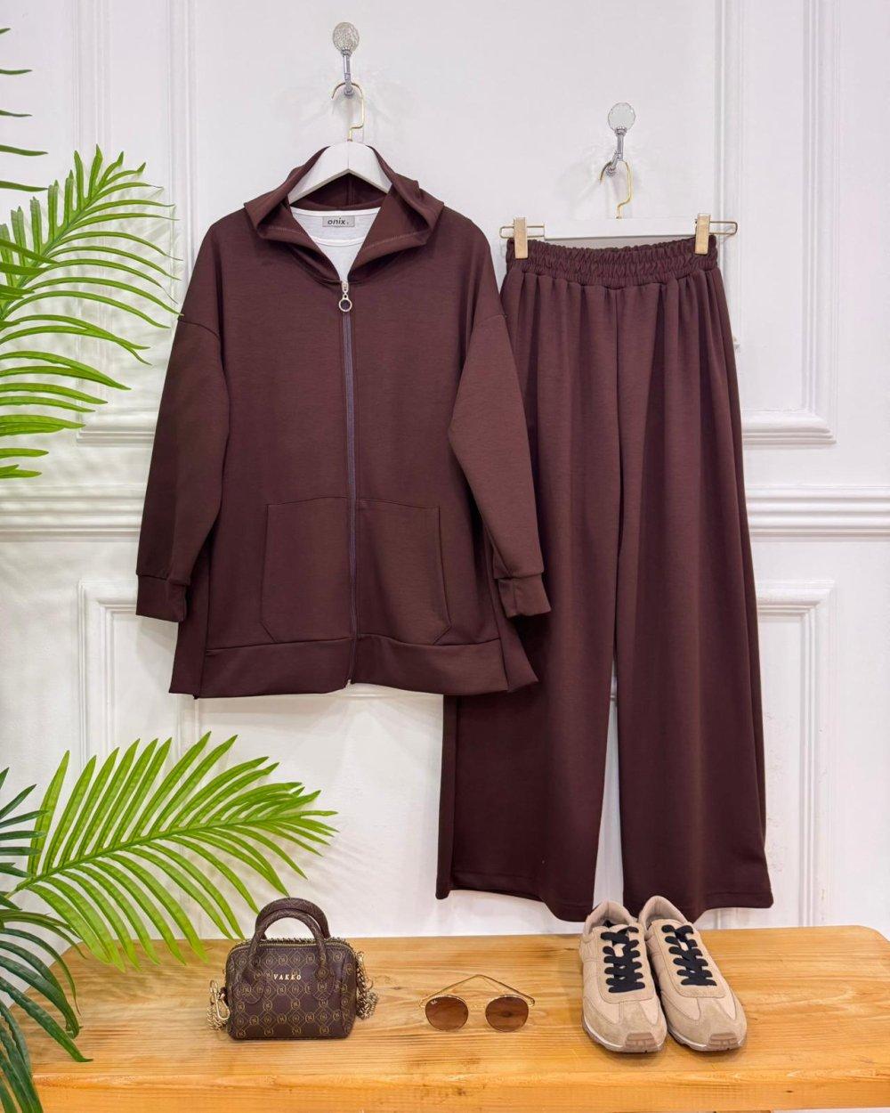 yırtmaçlıdır,kapşonludur,bilek kısmı manşetlidir-Pantolon bol paçadır,bel kısmı lastiklidir-yumuşak dökümlü likralı bir kumaşı vardır