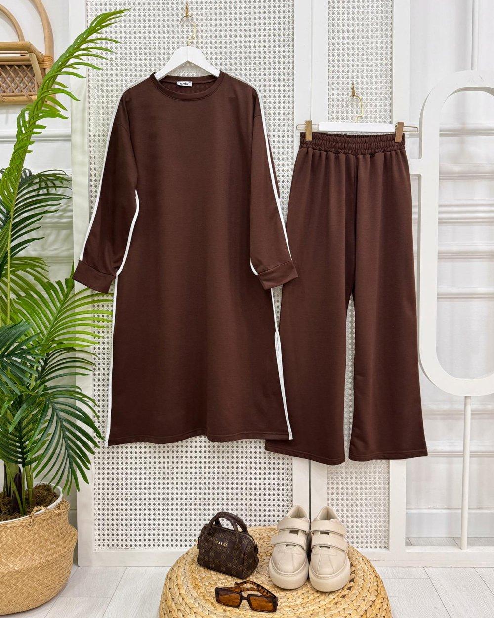 Ve altında dikme şerit detayları vardır-tuniğin yan kısımları yırtmaçlıdır-Pantolon bol paçadır ve  bel kısmı lastiklidir
