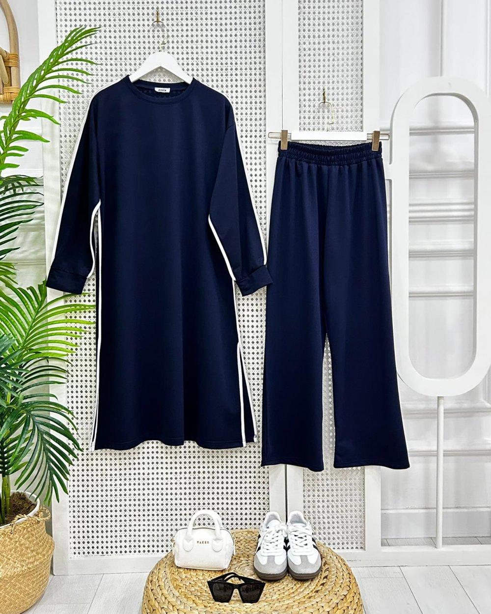 Ve altında dikme şerit detayları vardır-tuniğin yan kısımları yırtmaçlıdır-Pantolon bol paçadır ve  bel kısmı lastiklidir