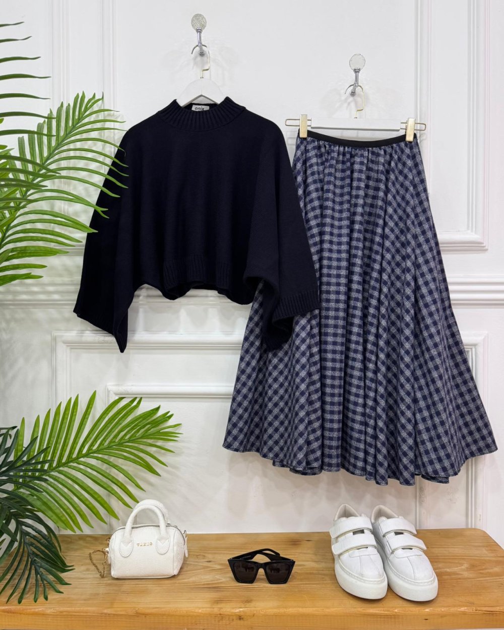 Ekru kazak,lacivert etek