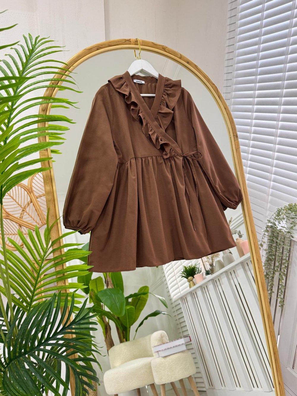 Yeni sezondur-bilek kısmı lastiklidir-Ön kısmı anvelop şeklindedir içten ve dıştan bağlamalıdır-Ön kısmında fırfır detayları vardır-Bel kısmında robalı büzgülüdür