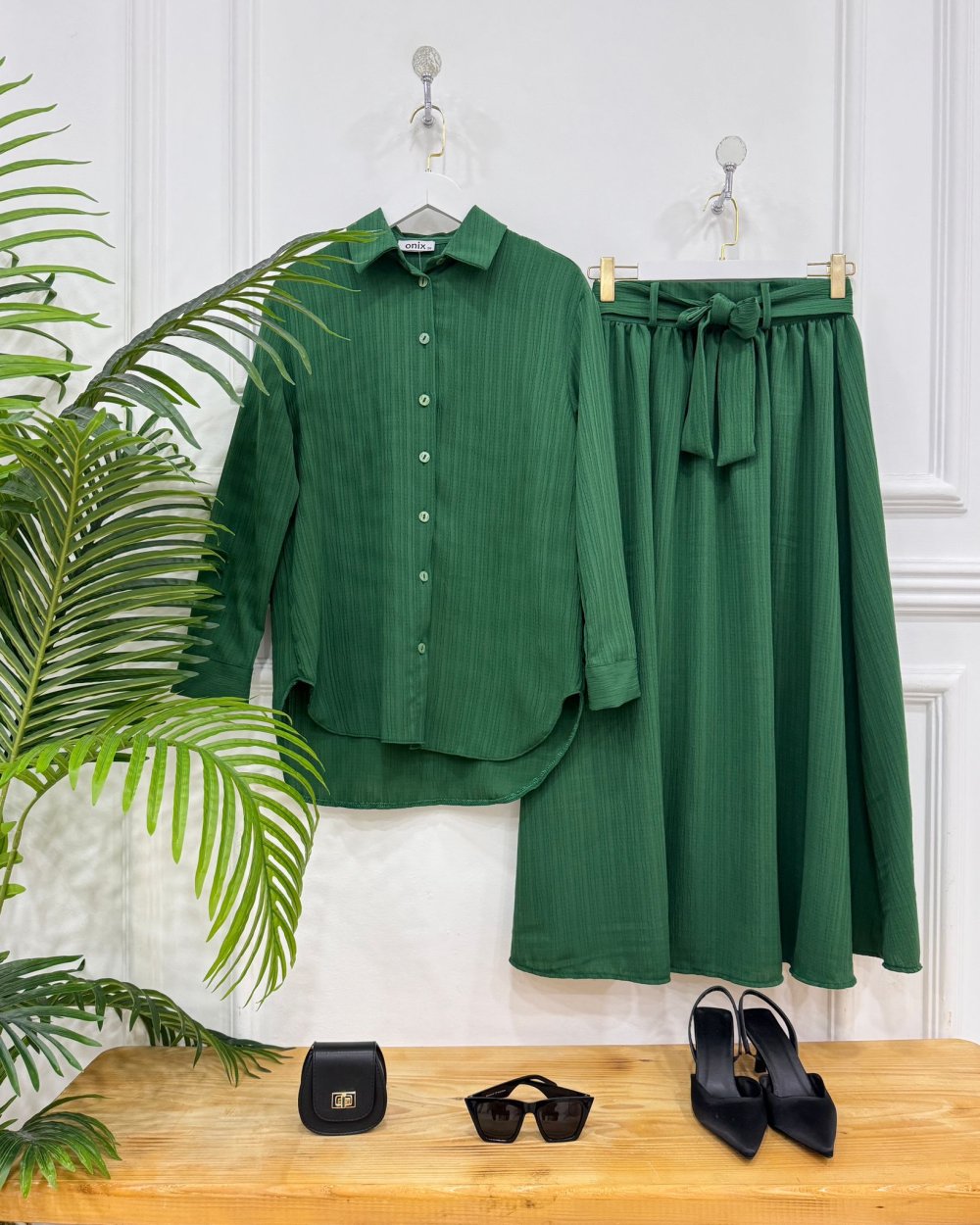 Yeni Sezon-Gömlek önü düğmelidir -Bilek kısmı düğmeli mansetlidir-Etek seyyar kemerlidir ve Köprülüdür  -Bel kısmı arkadan fermuarlıdır