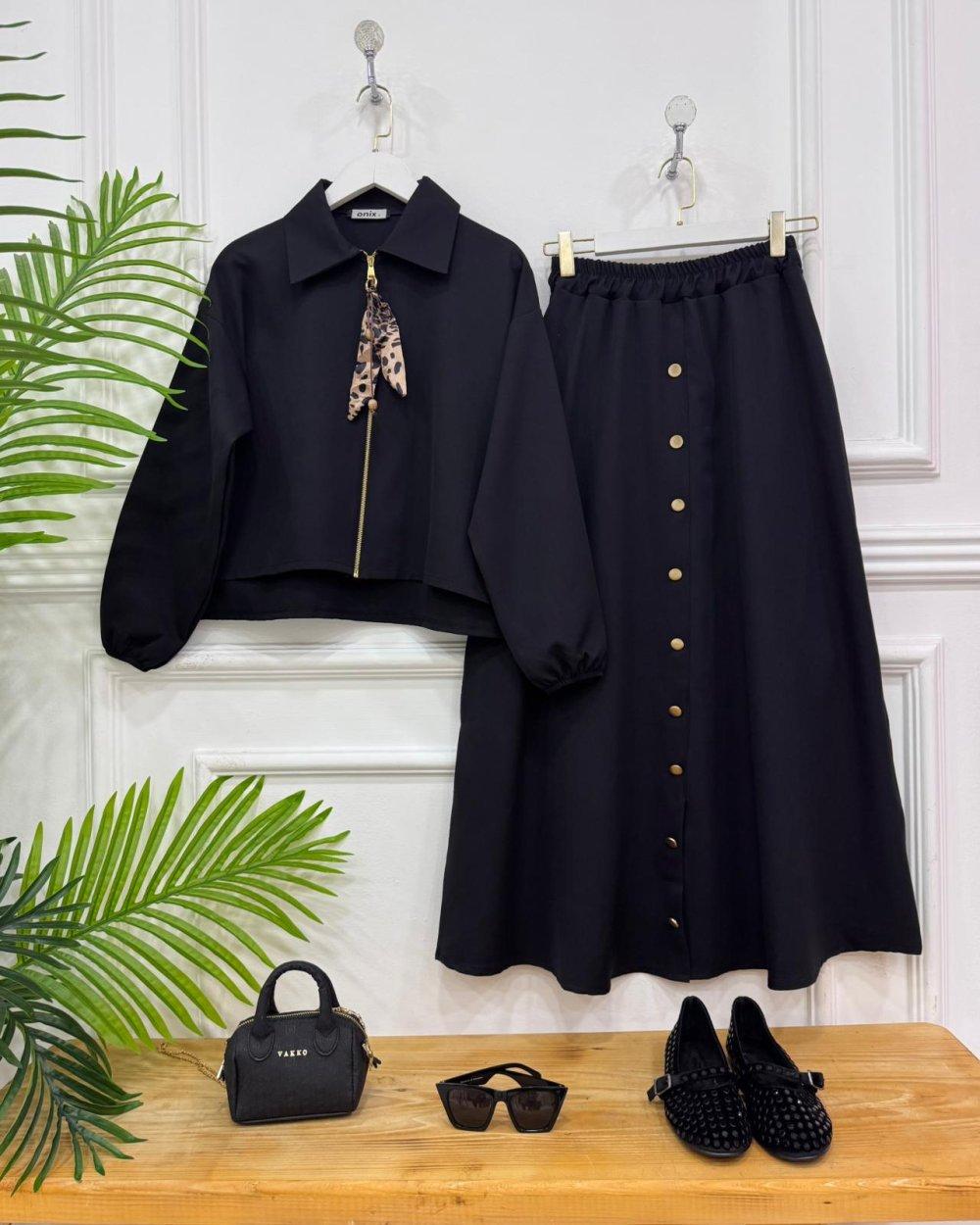 Yeni Sezon-Ceket ve etek olarak ikili takımdır-ceket ön kısmı fermuarlıdır,bilek kısmı lastiklidir -etek ön kısmı süs düğmelidir bel kısmı lastiklidir