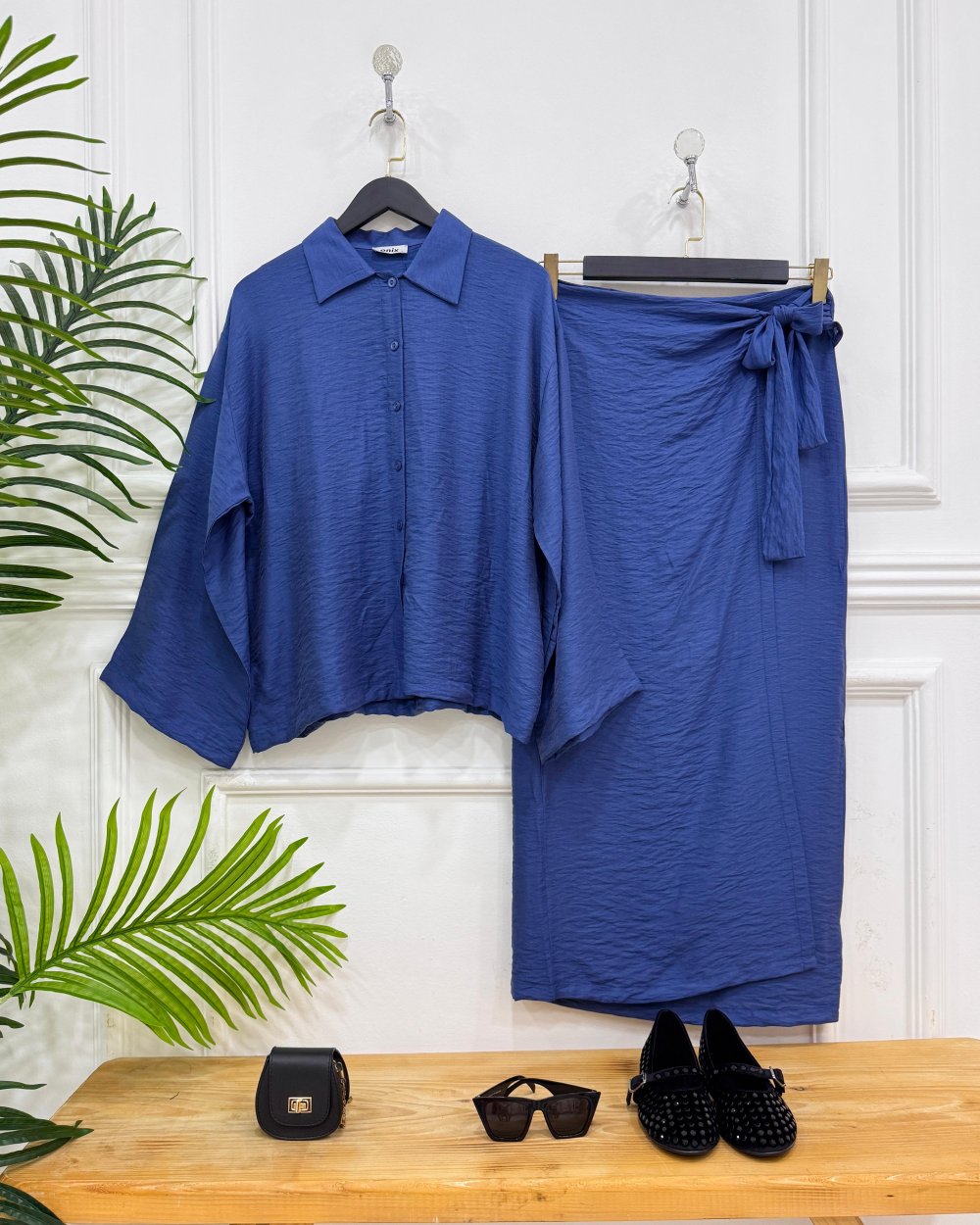 Yeni sezon-Gömlek ve etek olarak ikili takımdır-ön kısmı düğmelidir-Etek anvelop şekilde yandan bağlamalıdır fakat yan kısımıları dikişlidir açılmaz-Fermuarlıdır